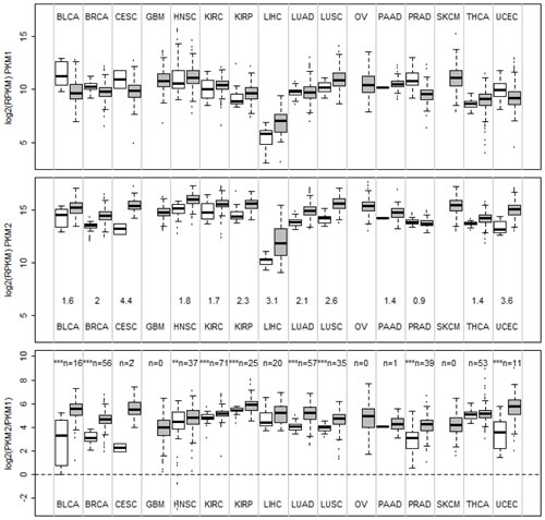 Determination of PKM1 and PKM2 expression levels in TCGA datasets